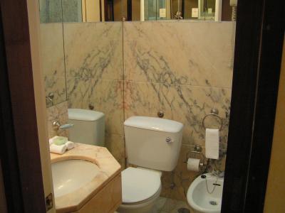 Das Bad ist so klein, das sich nicht mal eine 170cm große Person gerade auf die Toilette kann, mann muß sich schräg setzen, dann langsam die Knie unter das Marmorwaschbecken drehen und dann entspannen ...