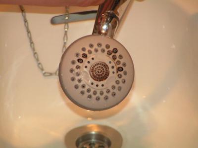 Dafür gibt es bisher ausreichend heißes Wasser, wie der Duschkopf aussieht haben wir mal festgehalten: